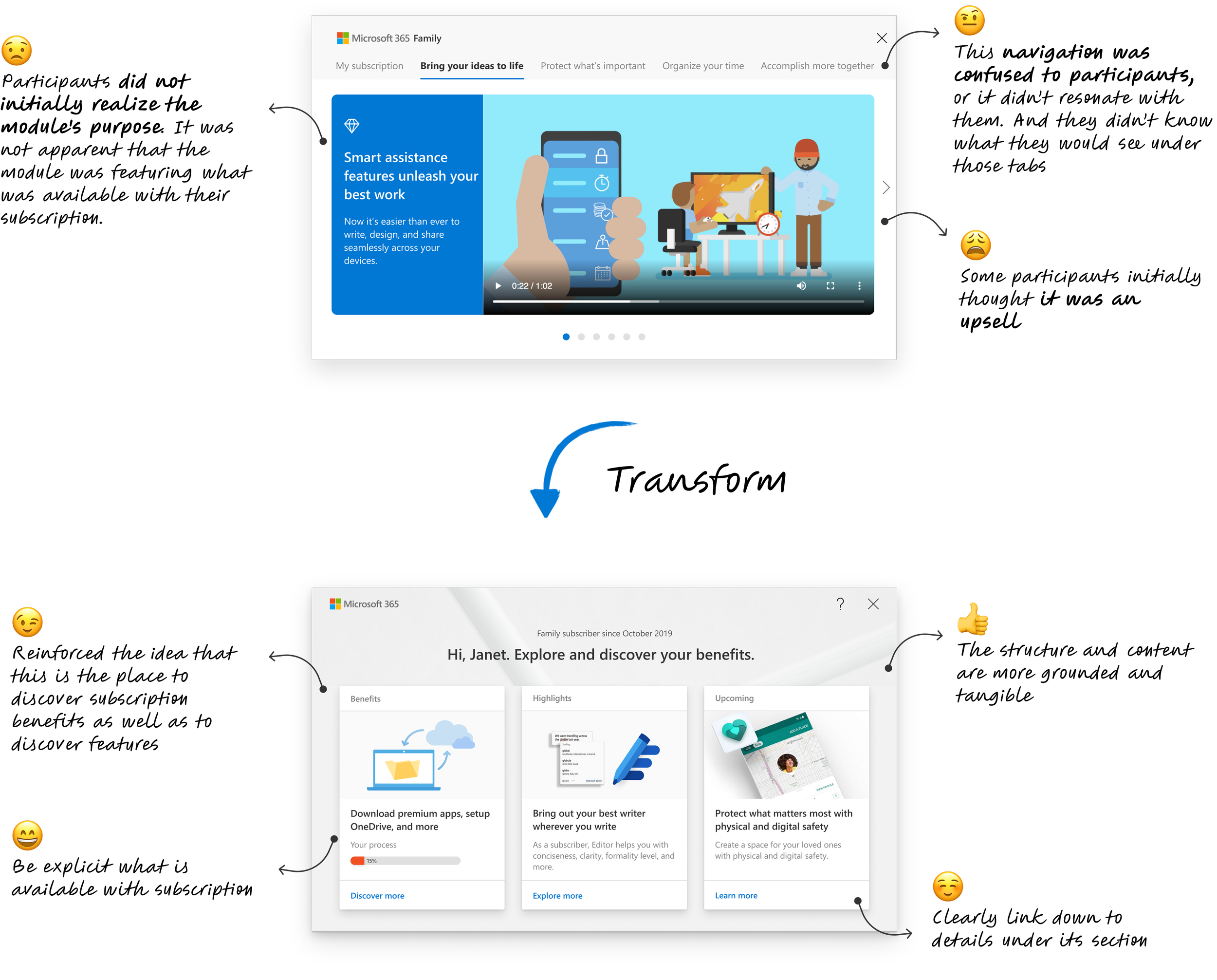 Despite Microsoft 365’s massive premium subscriber base, a significant discovery emerged from our research and data: many users weren’t aware of or utilizing their full subscriptions benefits. This awareness gap represented a missed opportunity for both user retention, satisfaction, and business growth.